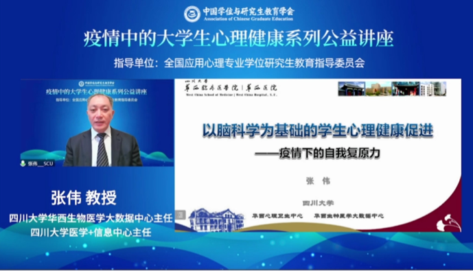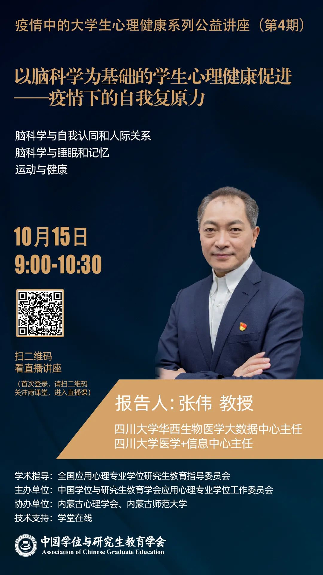 为助力内蒙古高校疫情防控工作,保障全区大学生心理健康,10月15日上午,由全国应用心理专业学位研究生教育指导委员会指导,中国学位与研究生教育学会应用心理专业学位工作委员会承办,内蒙古心理学会、英国365公司官网协办的“疫情中的大学生心理健康系列公益讲座(第4期)”在线上举行,特邀四川大学张伟教授做题为“以脑科学为基础的学生心理健康促进—疫情下的自我复原力”专题讲座,英国365公司官网全体师生和全区及全国的4000余名听众通过不同方式观看直播。讲座由全国应用心理专业学位研究生教育指导委员会副主任、北京大学吴艳红教授主持。