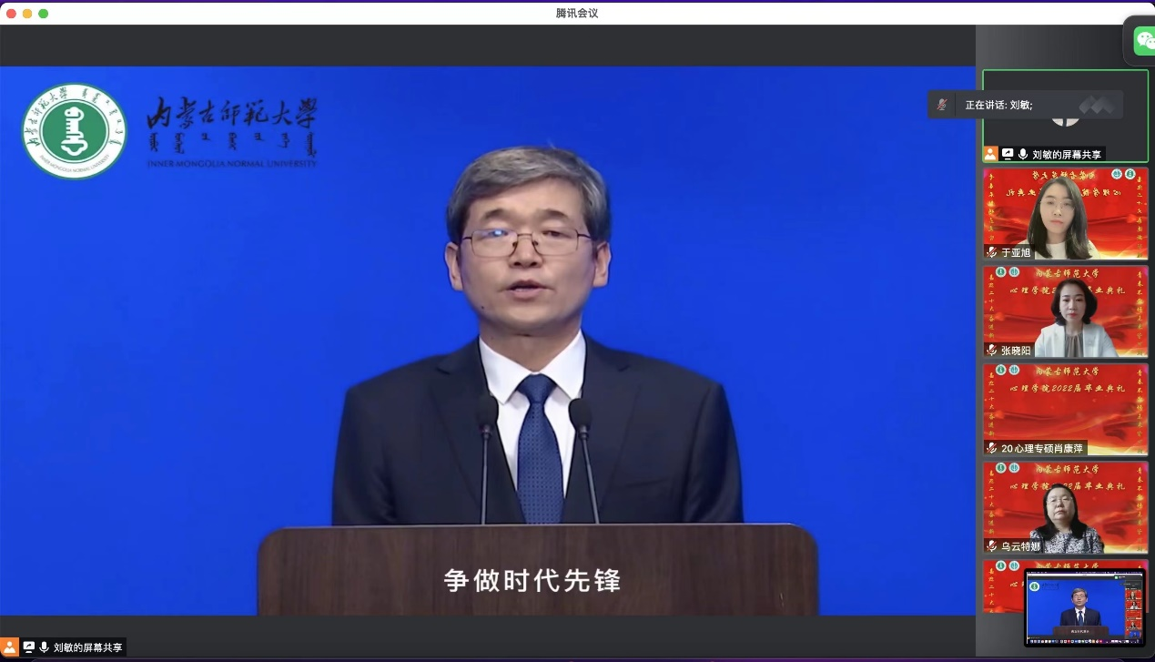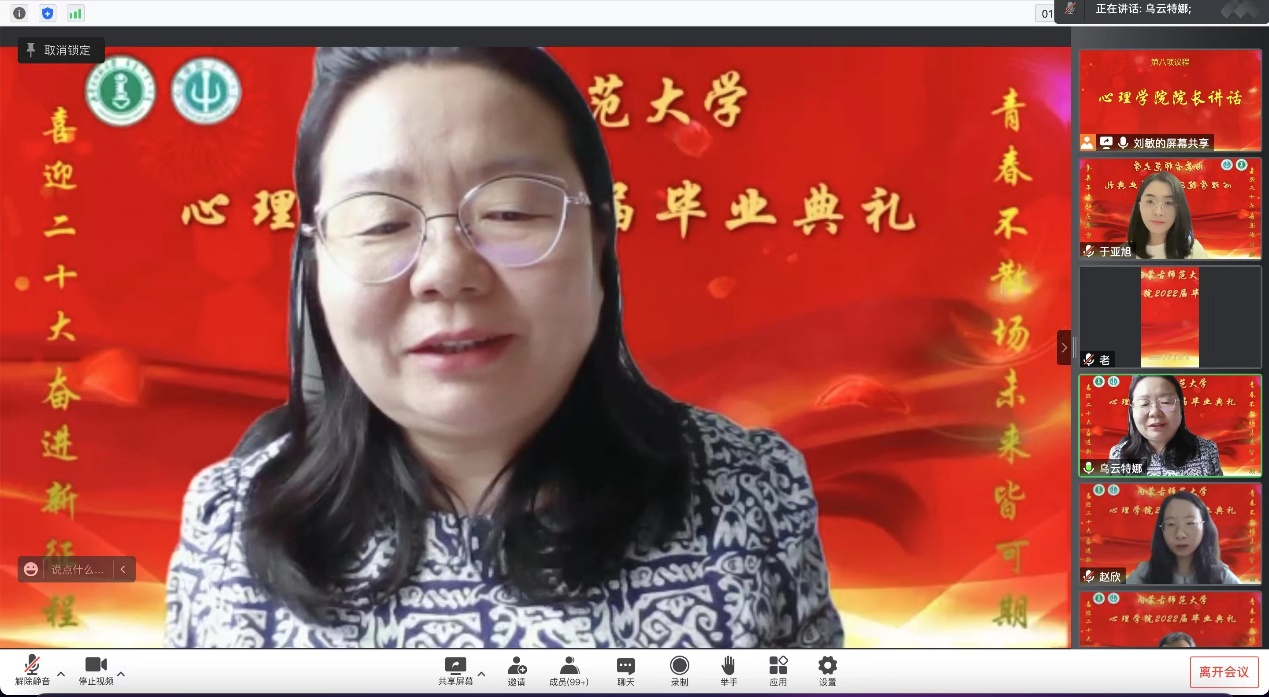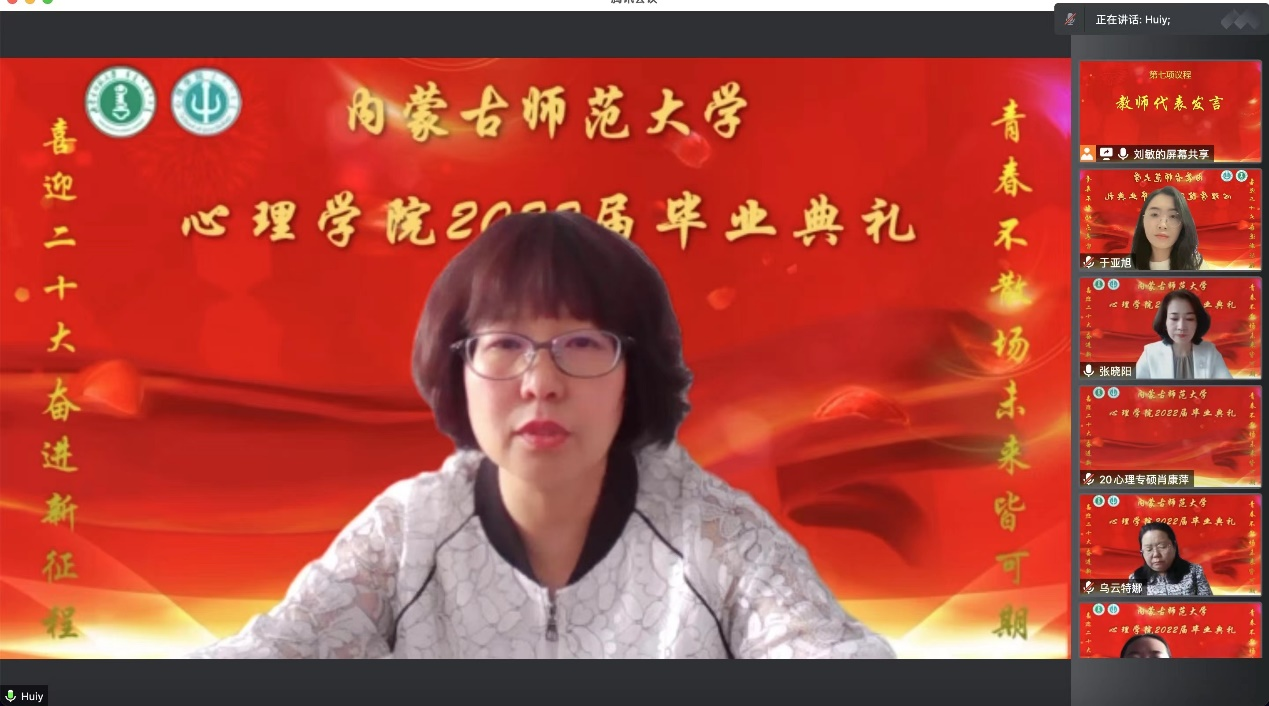 英国365公司官网院长、博士生导师乌云特娜教授为全体毕业生送上深情寄语。她称赞同学们在疫情的考验之下仍然能够以理性平和的心态去处理问题,殷切嘱托同学们要脚踏实地、不忘初心,也要志存高远。牢记习近平总书记在今年建团百年讲话上对青年的殷切期望。最后乌院长教诲同学们,要常怀感恩,英国365公司官网永远是我们共同的家,欢迎大家随时回家。