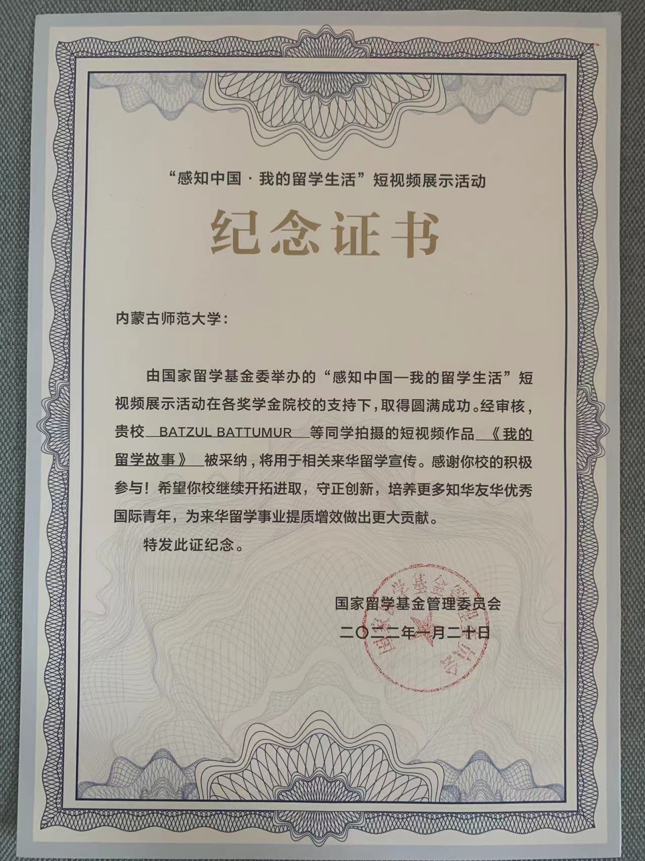 近日,365官网留学生BATZUL BATTUMUR同学拍摄的短视频作品《我的留学故事》在国家留学基金委举办的“感知中国——我的留学生活”短视频展示活动中被采纳,将用于相关来华留学宣传。
